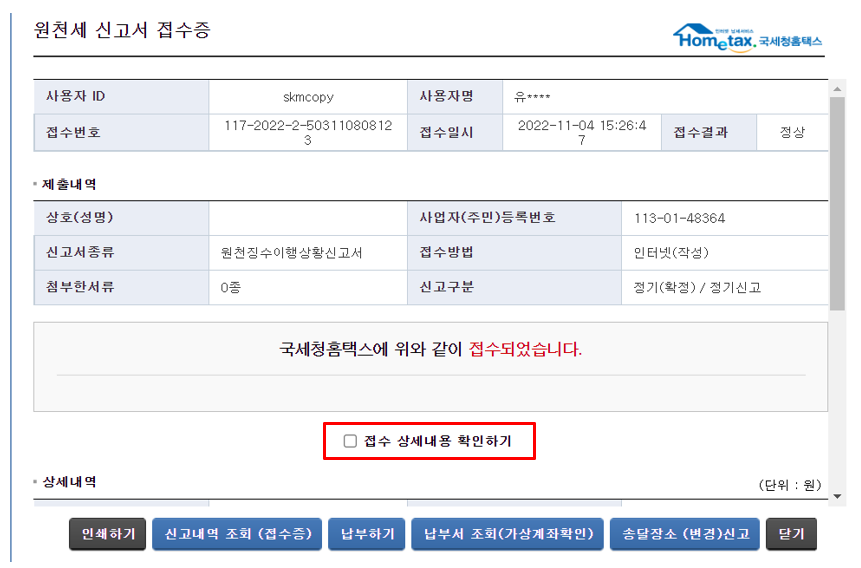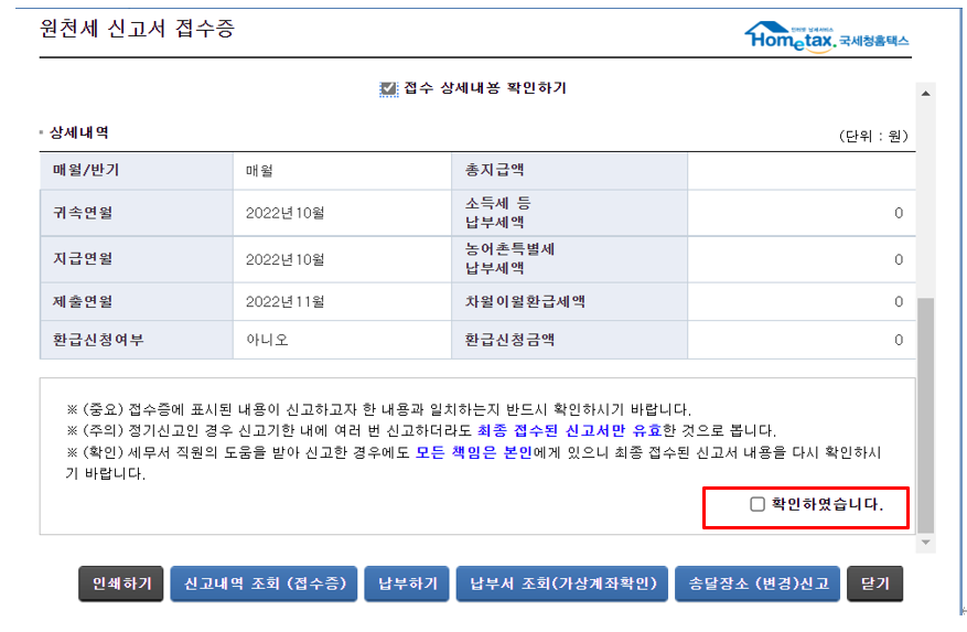 신고서 제출하기 선택 후 신고서 접수증이 나오는데 이때 접수 상세내역 확인하기 체크박스를 클릭하면 다시 확인하였습니다 의 메시지 체크박스를 클릭하여야 한다.