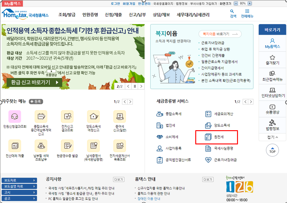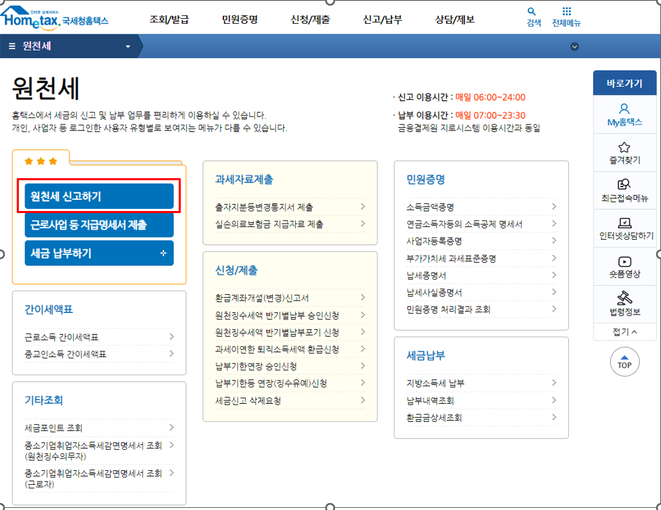 로그인 후 오른쪽 하단의 세금종류별 서비스 중 원천세를 선택한다.