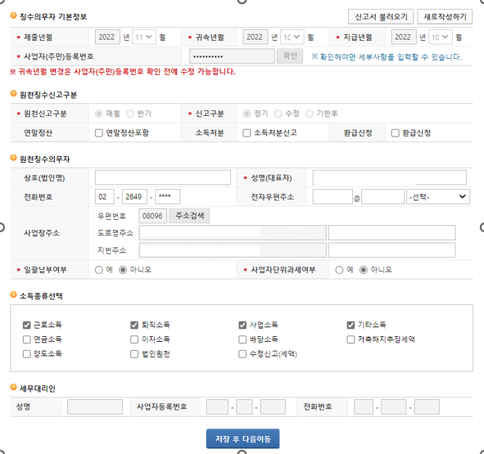 원천세를 선택하면 아래와 같이 원천세 신고하기 화면이 나온다.