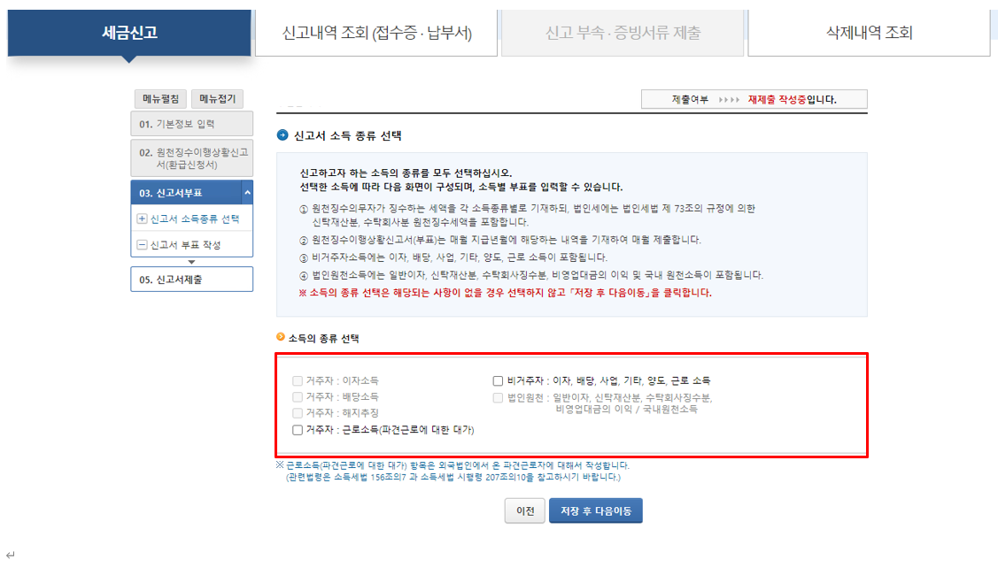 근로소득/퇴직소득/사업소득/기타소득(사업종류 선택에서 표시한 부분이 내역이 다 보여진다.) 이때, 근로소득만 선택한 경우에는 근로소득 입력분만 나타난다.
