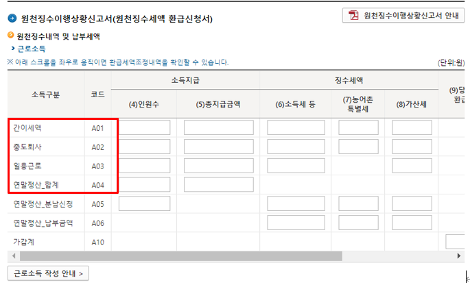 여기서 우린 어떤 내용이 있는지 알아보기 위해 근로소득/퇴직소득/사업소득/기타소득 이렇게 4가지를 선택하여 알아보자
