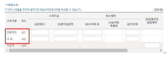 퇴직소득 : 직원 및 아르바이트생의 퇴직으로 인한 퇴직금이 발생하여 정산시 퇴직소득세가 발생하는 경우의 소득