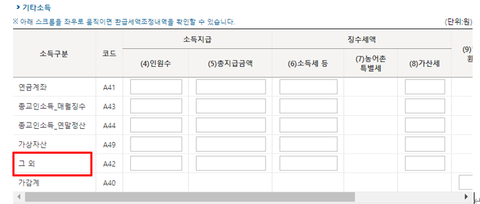 그외 : 기타소득이 일시적, 우발적으로 발생하여 인적용역 및 서비스를 제공받았을 때 입력.