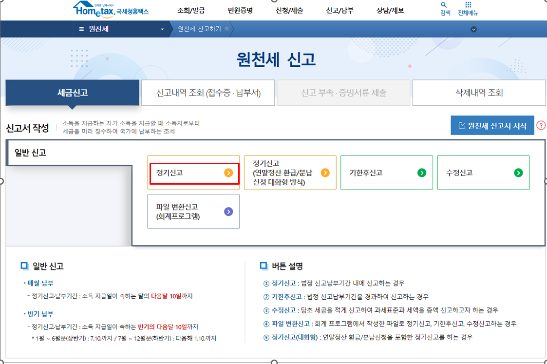 -신고구분 : 정기 / 수정 / 기한 후 신고(1일~10일사이에 정기적으로 신고하기에 정기 선택)