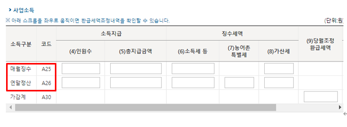 간이세액 : 직원 및 아르바이트의 인원수와 합계급여총액, 원천징수한 소득세 총액