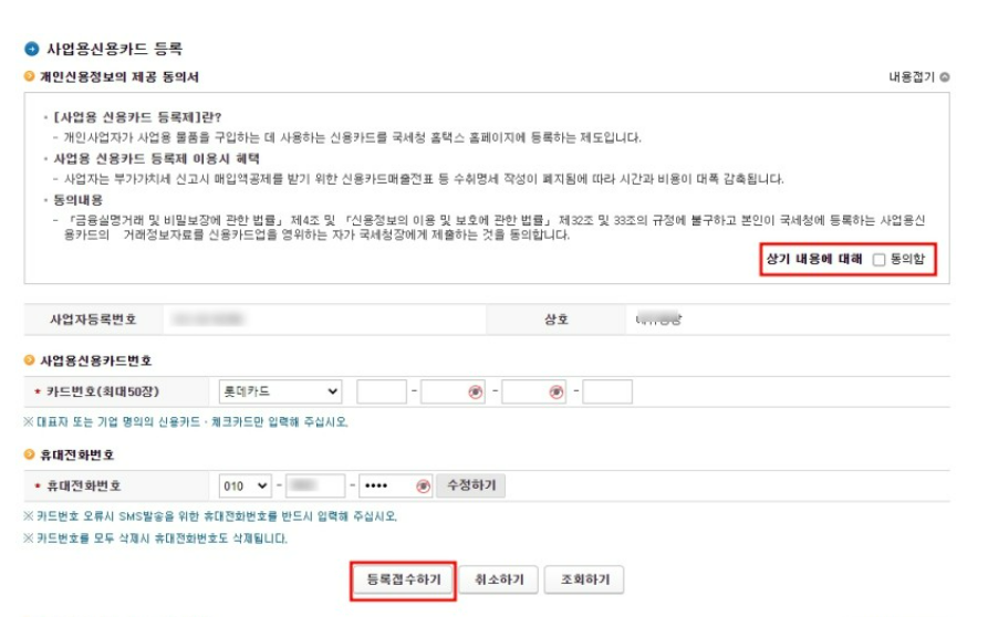 개인정보 동의서에 동의 후 사용하고 있던 신용카드 및 체크카드 중 사업용으로 쓰고자 하는 카드를 등록하자.
