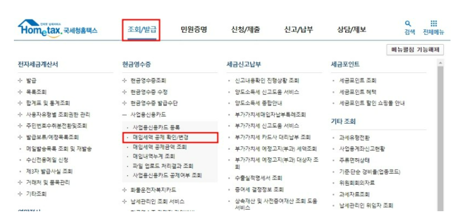 사용내역은 [조회/발급] / [사업용 신용카드] / [애입세액 공제 확인/변경] 메뉴에서 한다.