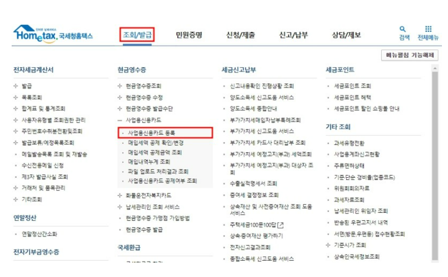 상단의 메뉴에서 [조회/발급] / [사업용 신용카드 등록]메뉴를 선택하자.