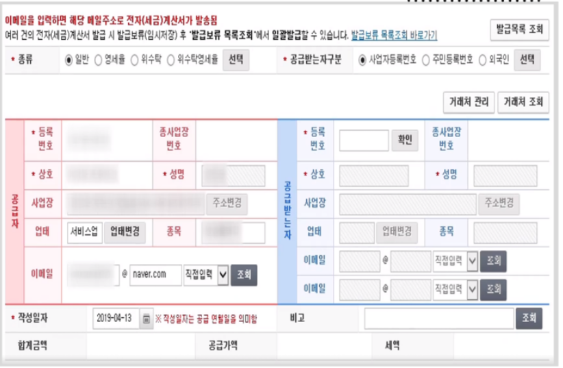 공급자 : 인증서로 로그인 하였기에 홈택스의 회원가입시 등록된 공급자의 정보가 자동으로 기입되어 있다. 즉, 발행인은 사업주체인 내가 된다.