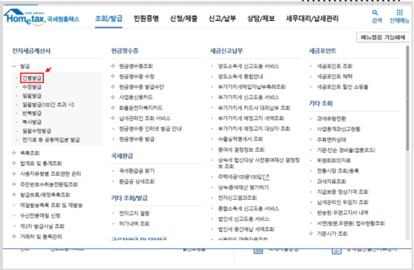 홈택스의 상단에 있는 [조회/발급] / [전자세금계산서] / [건별발급]을 선택하자.
