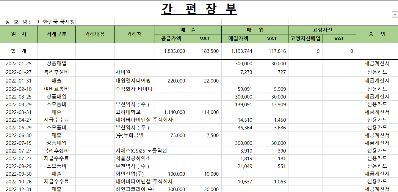 먼저, 간편장부 작성을 매월 작성해서 1년치를 작성 완료했다는 가정하에 간편장부 완성본이 아래와 같다.