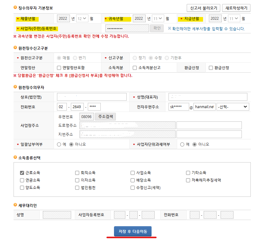 8. 신고서 소득종류 선택화면은 수정할 내용이 없으므로 [저장후다음이동]을 선택한다.