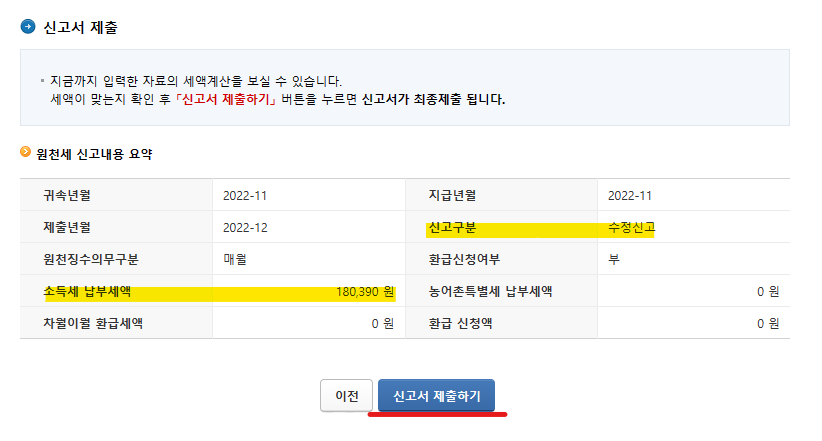 [신고서 제출] 화면에서 신고내용 요약을 확인한 후 [신고서 제출하기]를 선택하면 수정신고가 마무리 된다.