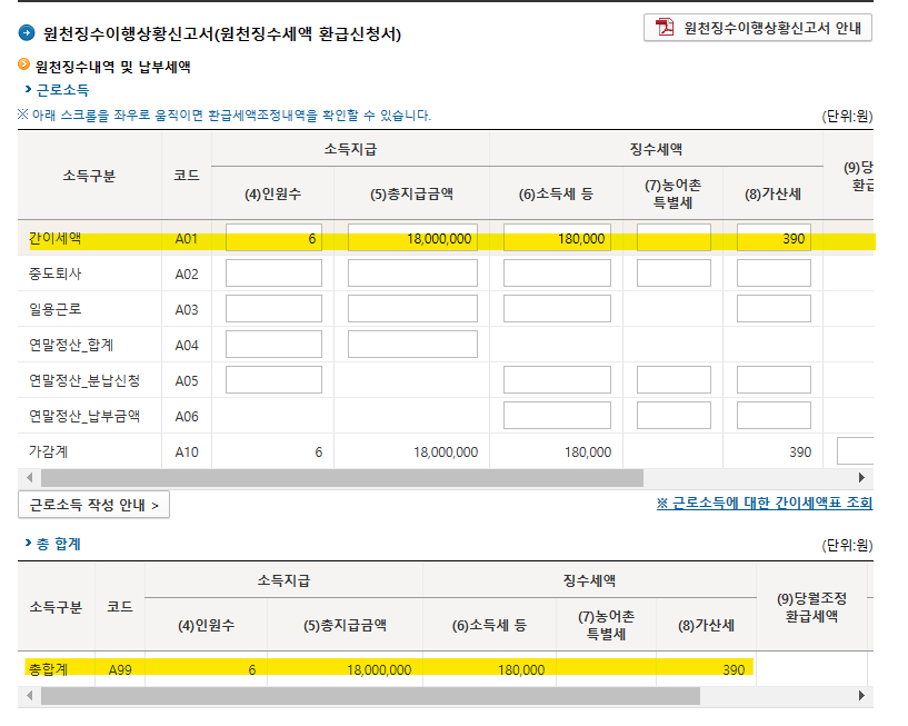 예제) 인원수 6명, 총지급금액 18,000,000원 소득세 180,000원, 가산세 390원
