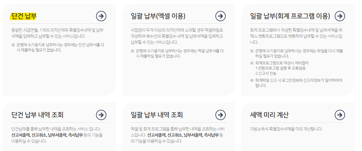 [단건납부]를 선택하면 [지방소득세 특별징수]의 화면이 팝업창으로 활성화 된다.