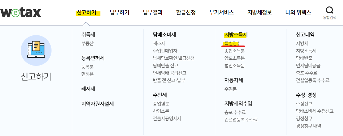 위택스 상단의 [신고하기] - [지방소득세] - [특별징수]를 선택하자.