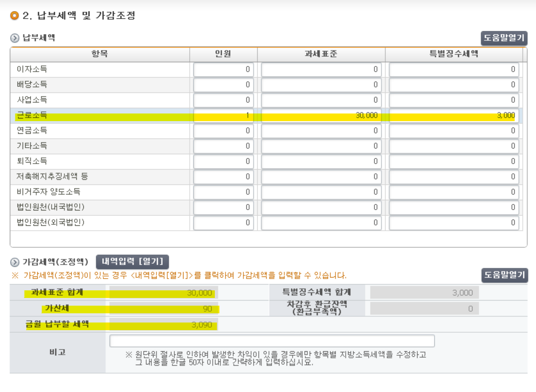 추가 납부해야 하는 지방소득세(주민세)는 3,000원 자동 계산된다.