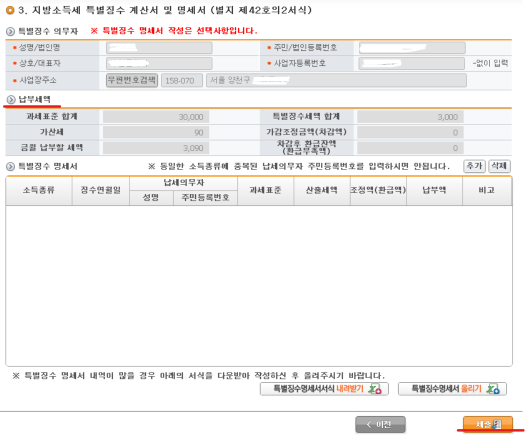 지방소득세(주민세)의 계산서 및 명세서 화면이다.