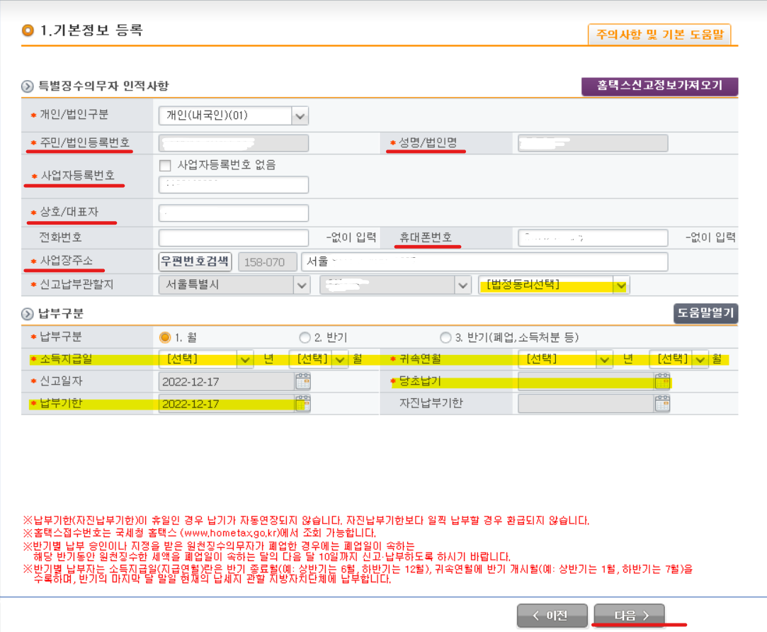 사업장의 기본정보 작성을 마쳤으니, 추가 신고되는 사항을 작성하자.